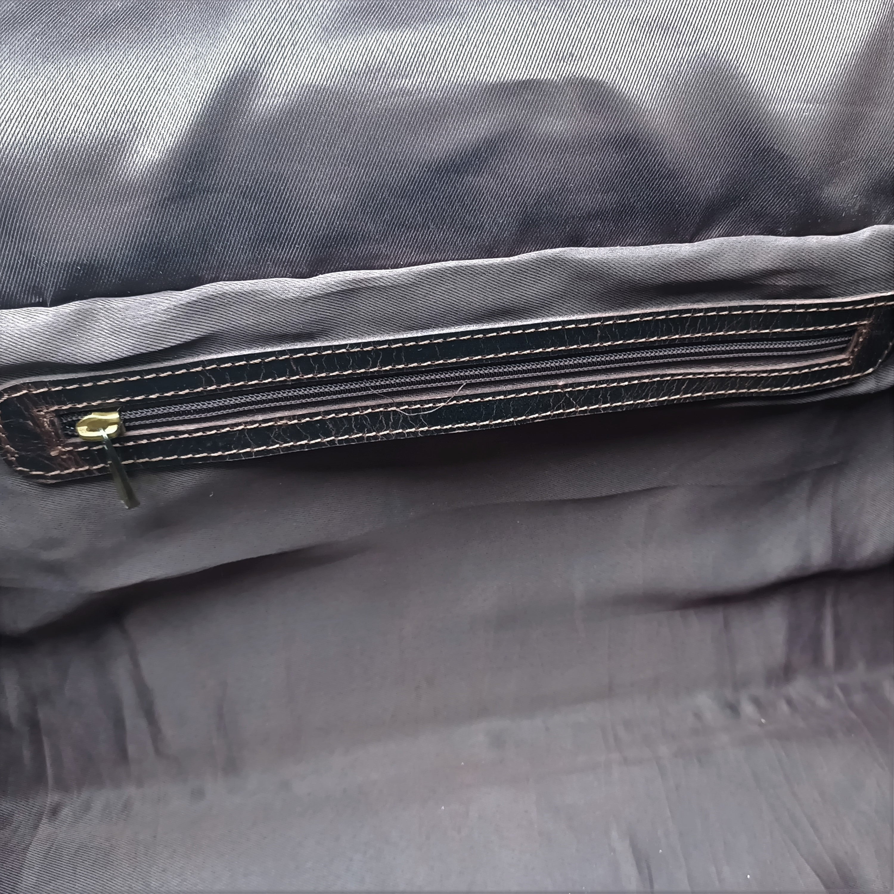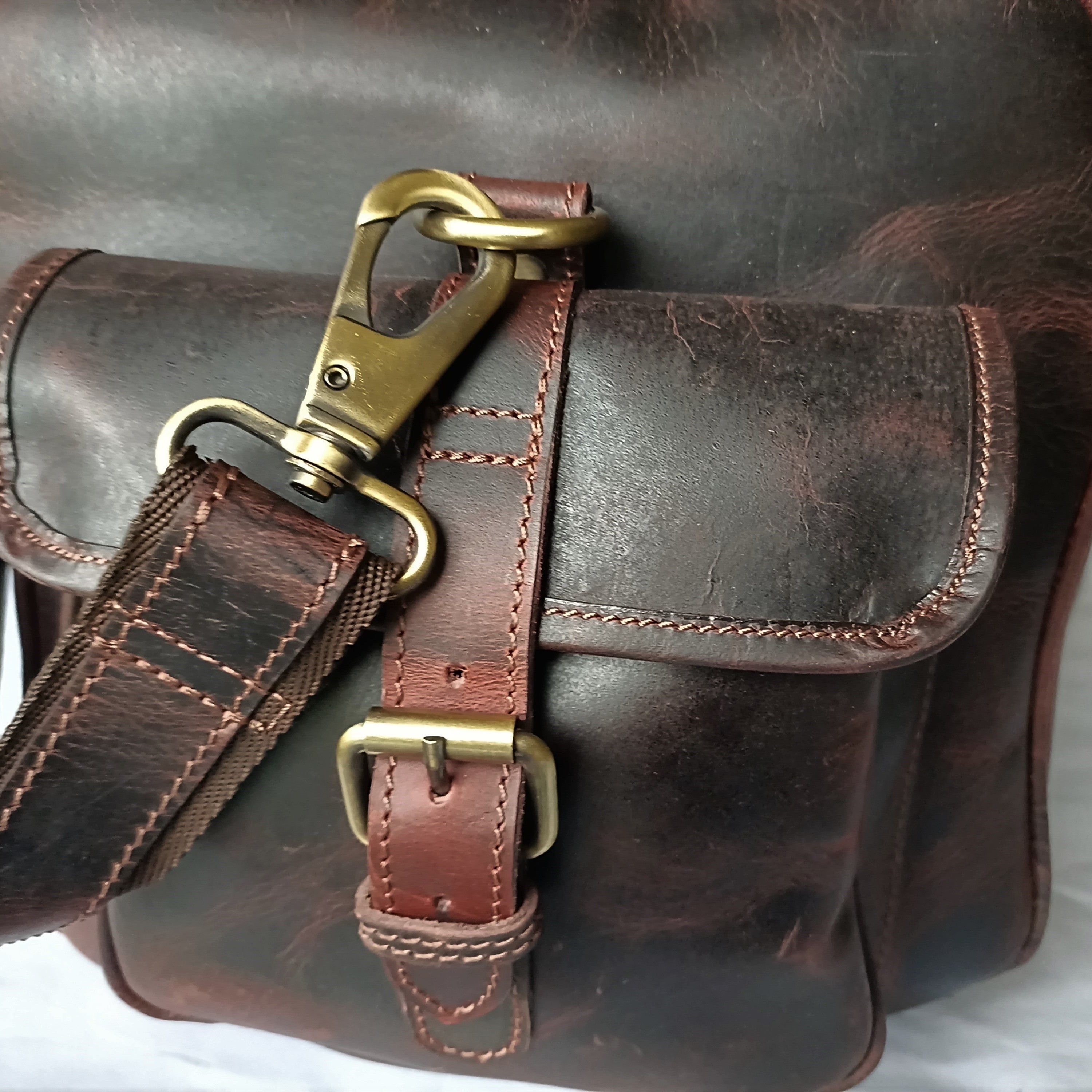 • The leather strap provides security to the main compartment closure.